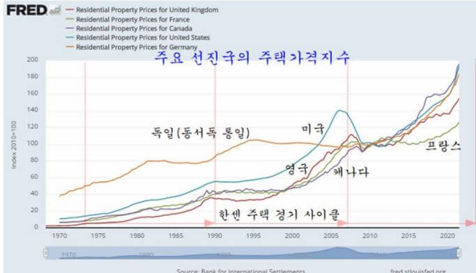 부동산으로 보는 한센주기로 17년 또는 넑게는 15년~20년 주기로 보고 있습니다. 1973년, 1990년, 2007년, 2022년 미국/일본/영국 부동산이 고점주기를 하고 있습니다. 부동산 한센사이클이 상승하면 건설, 철강, 조선, 금융 관련 산업에 호황이 올 수 있습니다. 통화량 증가 ▶ 건축착공증가 ▶ 임대료증가 ▶건설호황 ▶공급과잉 ▶ 하락