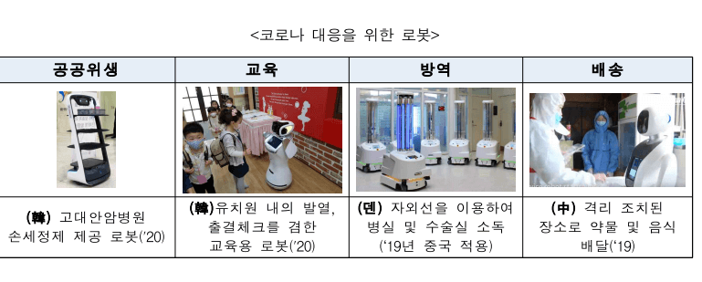 코로나 19 팬데믹 대응하여 ‘언택트(비접촉, 비대면)’ 수요가 큰 방역·안내·돌봄· 배달용 로봇 분야의 성장 가능성에 주목하였고 정부는 ‘돌봄, 웨어러블, 의료, 물류’ 등 4대 로봇 분야를 성장가능성이 큰 분야로 선언 택트 기술의 중요성이 높아지면서 기존 로봇과 차별화된 상황판단 기능과 자율 동작 기능이 확장되고 있어, 사람과 협력하는 차세대 로봇으로 고도화 중입니다. 또한 지능형 IoT 기반 로봇은 코로나 19 등에 적용 및 도입 확산되고 있습니다.