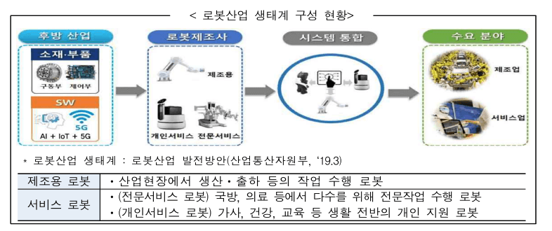 로봇산업은 로봇 제조사를 중심으로 후방산업인 소재, 부품 및 SW 분야와 전장 산업인 시스템 통합및 수요 분야(제조, 서비스)로 구성되어 있습니다.