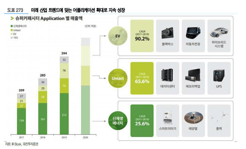 중형 슈퍼커패시터는 고출력과 긴 수명을 바탕으로 스마트미터기, 데이터센터, 신재생 에너지로 어플리케이션이 다변화되며 성장을 하고 있습니다. 올해 코로나 영향으로 스마트 미터기용 커패시터 매출이 한시적으로 부진했으나 하반기부터는 회복 국면에 접어들었으나 내년에는 기저효과에 따른 뚜렷한 성장세가 기대가 되고 있습니다. 또한 출력이 높고 단가 측면에서 상대적으로 저렴하다는 장점이 있어 중장기적으로 수소차용 커패시터 납품도 가능할 전망이어서 더욱 탄력적인 성장이 기대다 되고 있습니다. 이외에도 트램, 창고물류자동화, ESS 등 산업 전반적으로 슈퍼커패시터 적용이 검토되고 있어 매출 성장이 지속될 것으로 전망하고 있습니다. 이외에도 트램, 창고물류자동화, ESS 등 산업 전반적으로 슈퍼커패시터 적용이 검토되고 있어 탄력적인 매출 성장이 지속될 것으로 전망하고 있습니다.