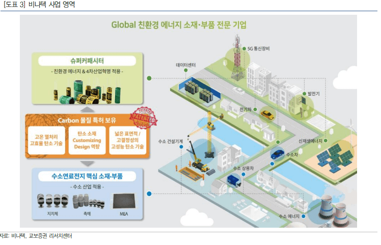 비나텍은 지난 9 월 23 일 이전 상장(코넥스 → 코스닥) 한 너지 저장 장치인 슈퍼캐퍼시터및 수소연료전지 소재의 부품을 판매와 제조를 하는 친환경기업입니다. 탄소 소재 관련 기술을 활용하여 슈퍼 커패시터(Super Capacitor), 수소연