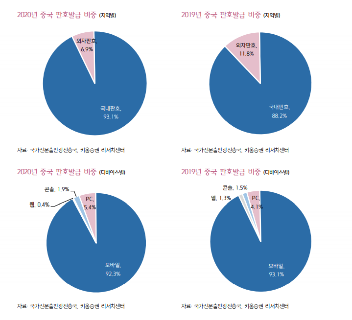 중국 시장의 되살아난 성장성, 코로나 영향은 크지 않아 중국 게임 시장은 작년(2020년) 기준으로 2,787억 위안(약 46.7조 원)을 기록할 것으로 전망되었다. 이 중 모바일 게임 시장은 2,097억 위안(약 35조 원)으로 전체 시장의 75.2%를 차지하고 있습니다