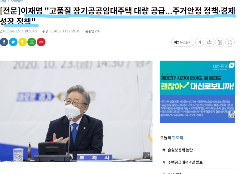 지난 20년 12월 이재명 경기도 지사는 공공택지 요지에 싸고 품질 좋은 고급의 중산층용 장기 공공임대주택을 대량 공급하여 싱가포르처럼 모든 국민이 집을 사지 않고도 집 걱정 없이 살 수 있도록 해야 한다고 밝혔습니다. 또한 이재명 경기지사는 지난 11월 주택시장 안정화를 위해서 정부에 공공임대 주택을 대폭 확대를 해야 한다는 건의를 하기도 하였습니다.