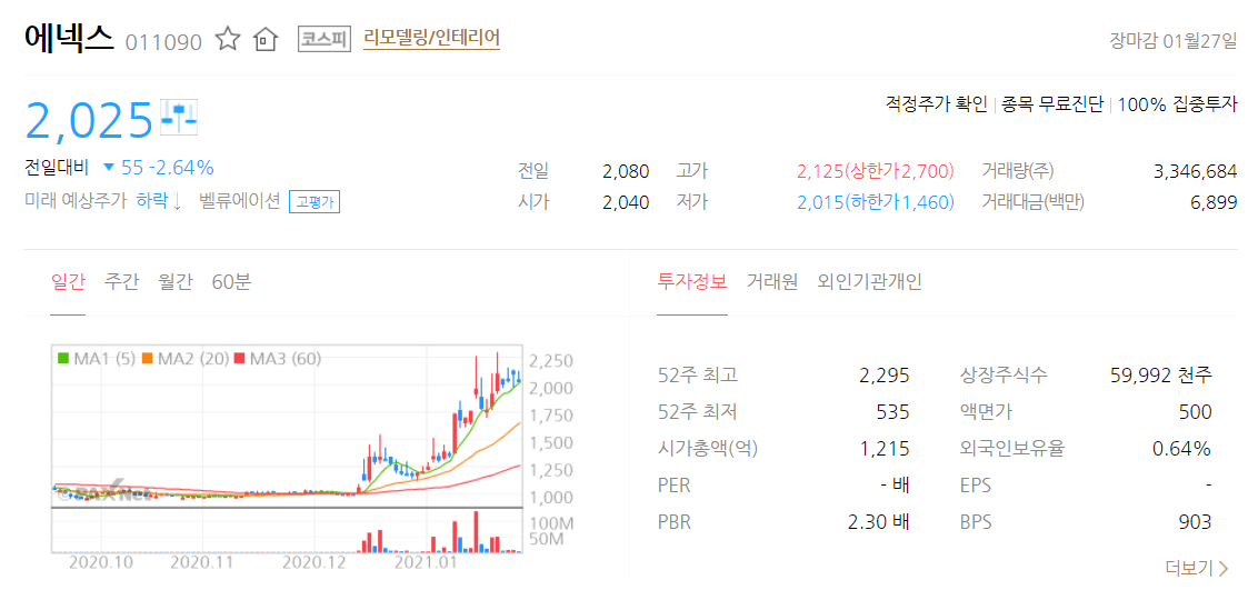 공공주택을 대량 공급을 하게 되면 인테리어 업체들의 수혜가 예상이 되는데요 관련 종목으로는 현재 01.27일 기준으로 현대리바트(시총 3,624억 원), LG하우시스(시총 7,506억 원), 하츠(시총 1,239억 원) , 에넥스(시총 1,215억 원) 등이 있습니다 그중 공공임대주택 인테리어 관련으로 가장 크게 상승하는 1등 종목으로 대장주라고 하는 에넥스가 있습니다.